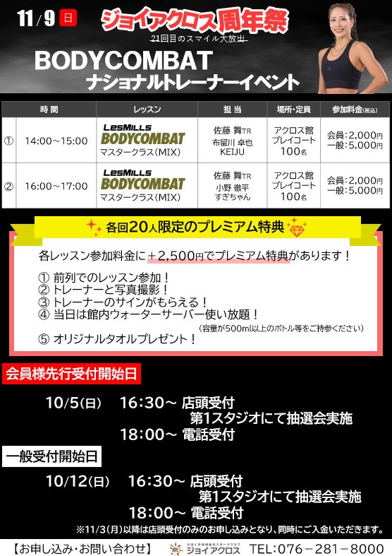 2025年11月9日(日)、ジョイアクロス周年祭特別レッスンとして【BODYCOMBATナショナルトレーナーイベント】を開催します!