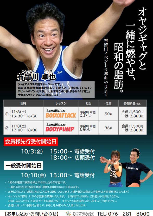 2025年11月8日(土)、ジョイアクロス周年祭特別レッスンとして【あの男が今年も帰ってくる!布留川インストラクターによるスペシャルイベント】を開催します!
