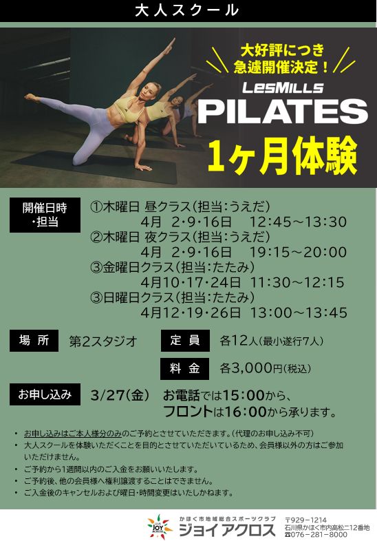 【LesMILLS PILATES(レズミルズ ピラティス)】一ヵ月体験2026年4月のお知らせ![]()