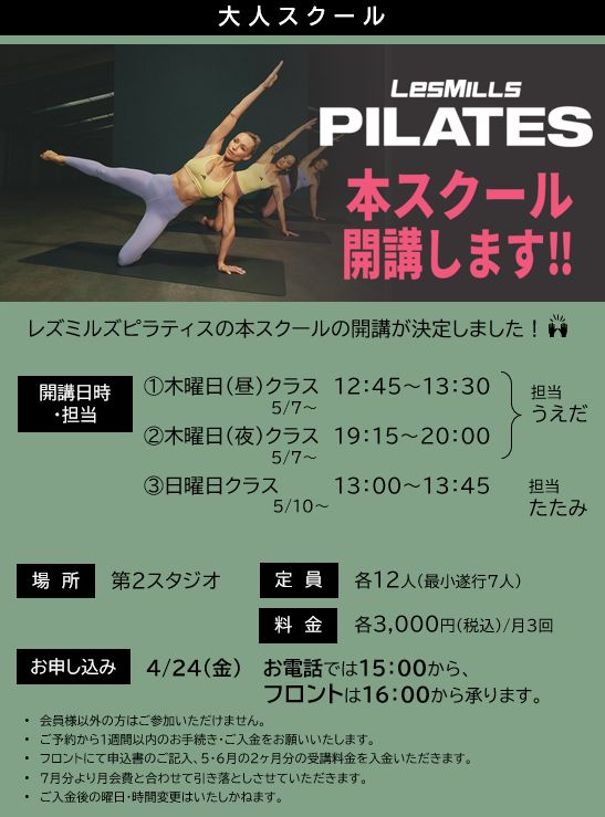 大人スクール『LesMILLS PILATES(レズミルズピラティス)』のお知らせ![]()