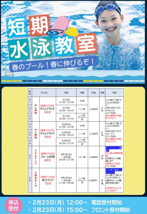 ジュニアスイミング春の短期教室開催! 2026年2月23日(月・祝)より受付開始
