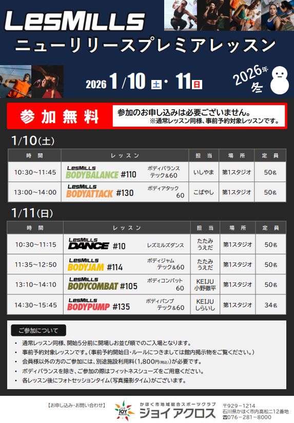 『LesMILLSニューリリース(新曲)プレミアレッスン in winter 2026』のご案内![]()