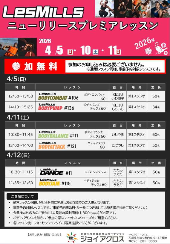 ジョイアクロスの『LesMILLSニューリリース(新曲)プレミアレッスン in spring 2026』で盛り上がろう!