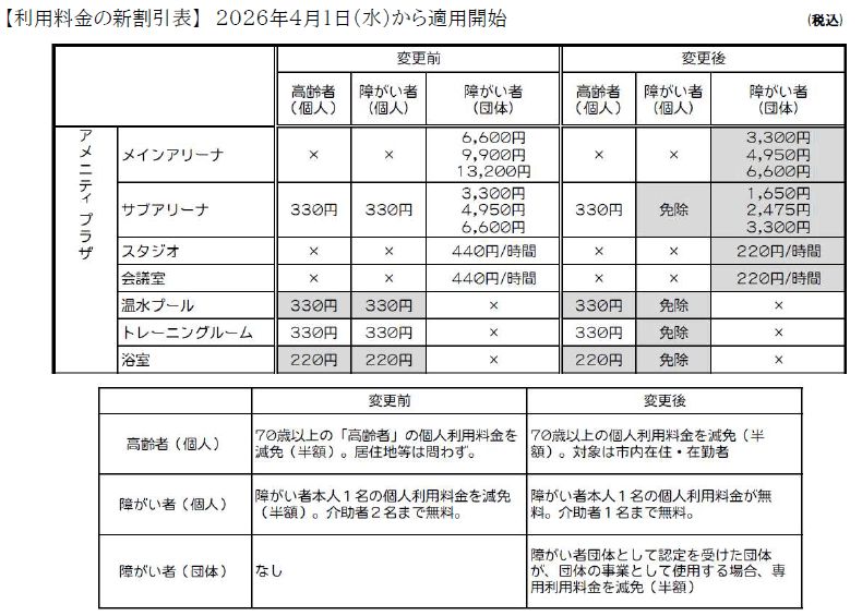 この度、2026年度4月1日利用分より、湖西市条例改定に伴い、社会体育施設の割引制度が改定となりました。