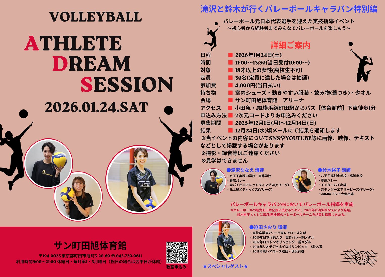 アスリート・ドリーム・セッション バレーボール教室【2026年1月24日(土)開催】滝沢ななえ/鈴木裕子/スペシャルゲスト:迫田さおりが講師で参加