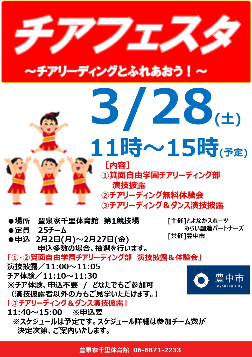 3月28日(土) 豊泉家千里体育館にて「チアフェスタ」を開催いたします。
